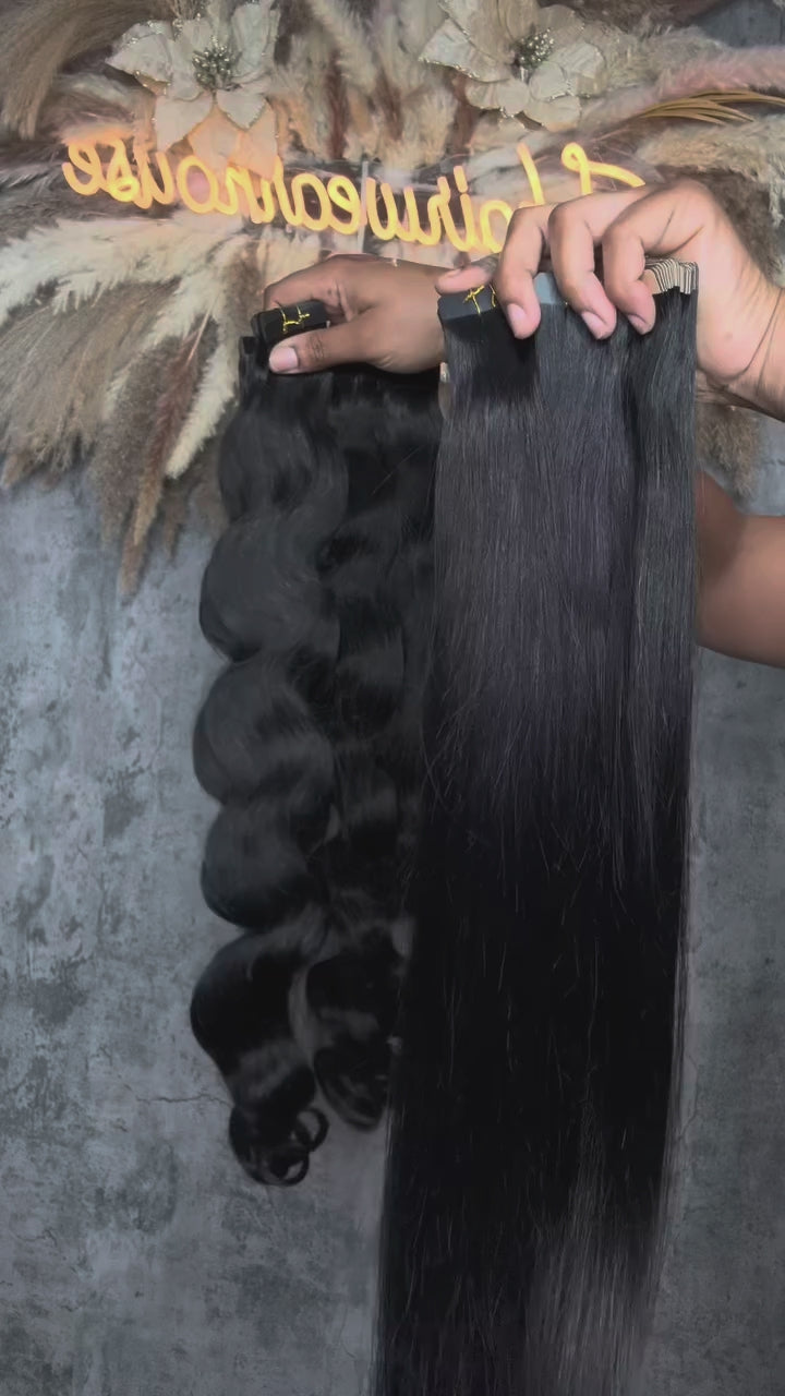 Upgrade your hair game with our Human Hair Tape-In Extensions, crafted from 100% raw, unprocessed human hair for a sleek, natural look that’s all about effortless elegance!